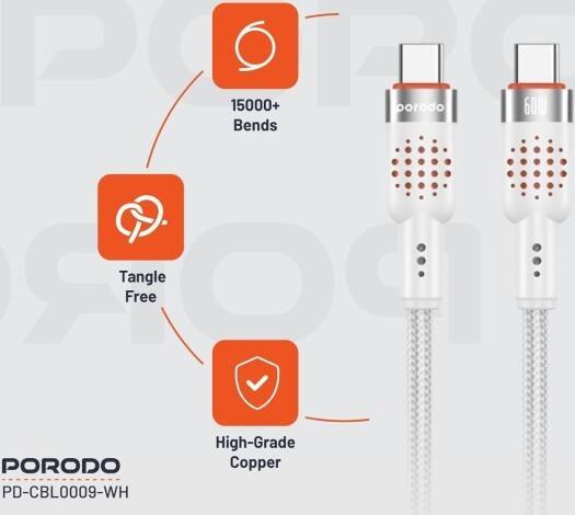كابل ألومنيوم مضفر من بورودو USB-C إلى USB-C بطول 1.2 متر شحن سريع PD بقوة 60 وات , ابيض